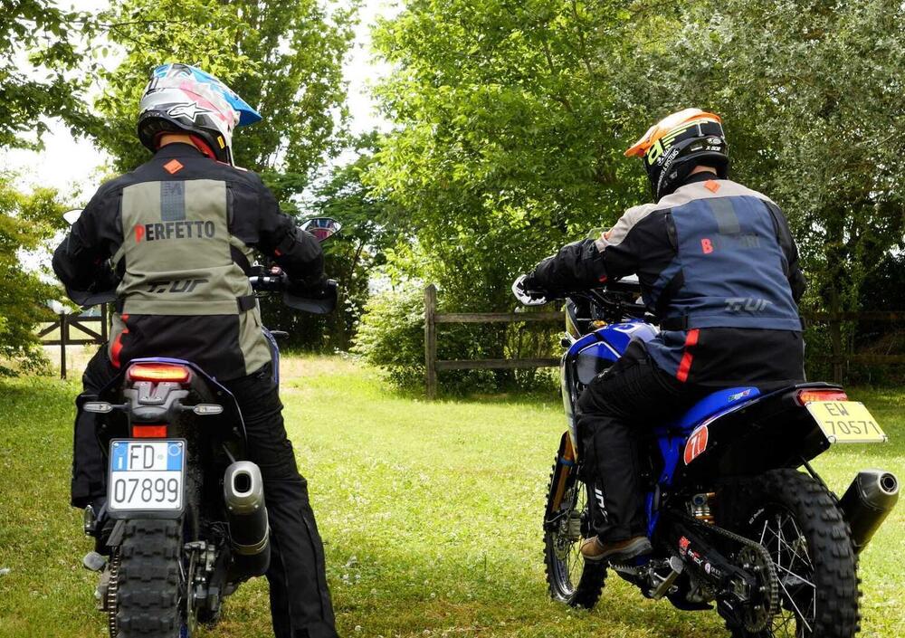Per presentarvi i capi Transfer, Roadbook e Gibraltar sono scesi in campo Alessandro Botturi, che da 5 anni sviluppa l'abbigliamento per T.ur, e il sottoscritto, grande conoscitore di T.ur per il severo impiego che faccio dei loro prodotti nel corso dei miei test. Insieme vi raccontiamo le caratteristiche nella sede della Tram School di Enduro e poi partiamo per un test in sella alle Ténéré. Perché l'occhio vuole la sua parte, ma una giacca o un pantalone poi vanno provati sul serio, guadi compresi!
