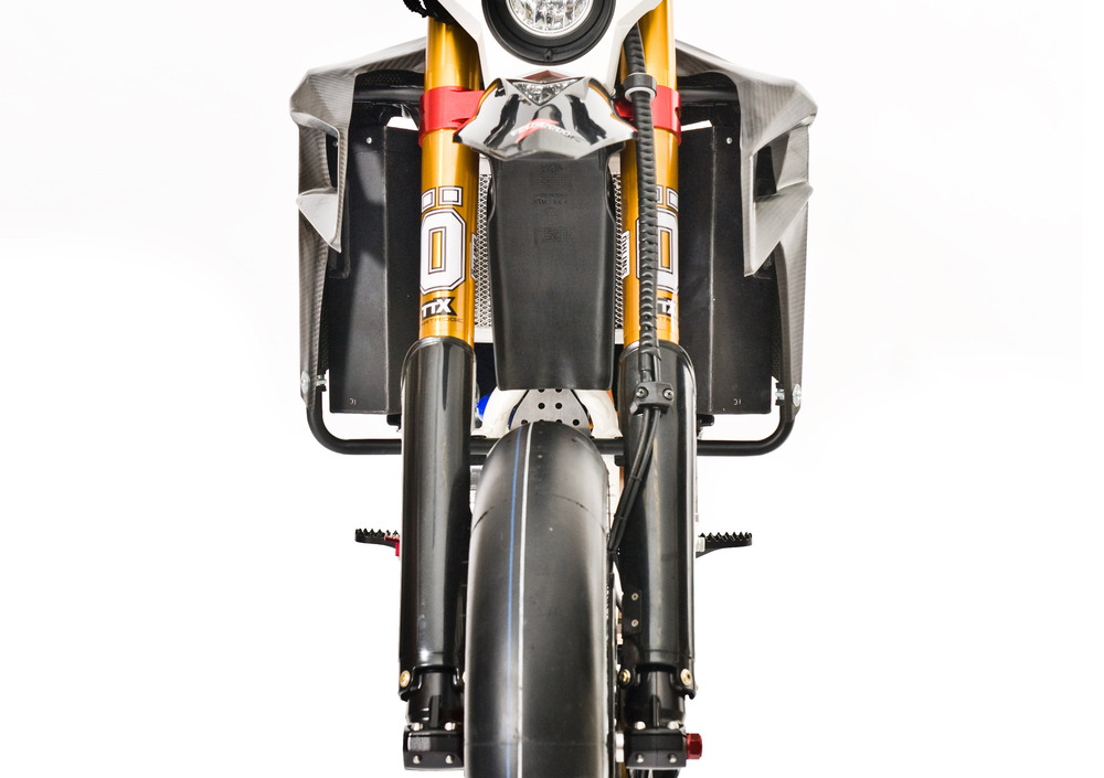 La moto è equipaggiata dal blocco motore, nella sua versione più evoluta, più leggero e performante, accoppiato al cambio a 5 rapporti. Trattandosi di una supermotard, sono state riviste le quote ciclistiche ed è stato implementato il reparto freni: la moto adotta una forcella Ohlins TTX, fornita dal partner italiano Andreani, completamente regolabile con setting separati per le alte e le basse velocità. Al posteriore il mono ammortizzatore, sempre marchiato Ohlins, completa il sistema di sospensione.
