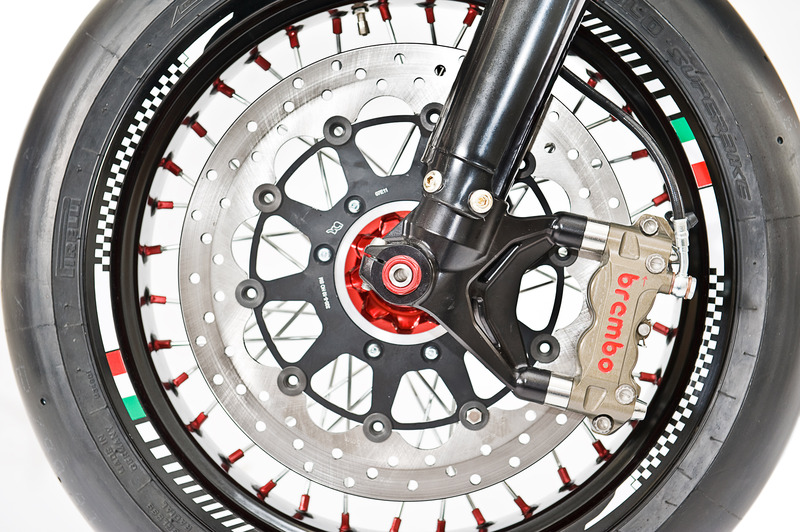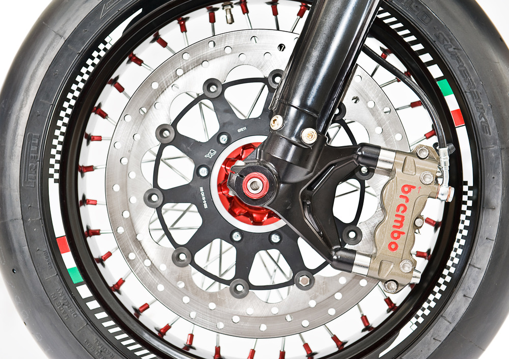 Le ruote a raggi da 17' sono fornite su specifiche dalla FA-BA, realizzate con mozzi CNC e cerchi in alluminio; montano coperture racing Pirelli (Diablo SBK), ideali per l'utilizzo in pista, nelle misure 12/70-17 all'anteriore e 160/60-17 al posteriore. Le stesse misure saranno omologate per l'utilizzo su strade aperte al pubblico, garantendo così ai clienti un'ampia scelta di coperture stradali.