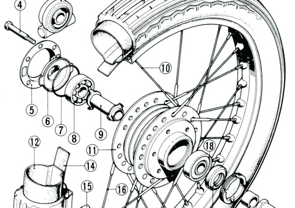 Una ruota di questo tipo è costituita da un cerchio collegato al mozzo (nel quale è incorporato il freno, se è a tamburo) da una serie di raggi che lavorano solo a trazione. Del resto, non possono fare diversamente: i fili metallici sopportano molto bene i carichi di trazione ma non quelli di compressione, come chiunque può constatare.
