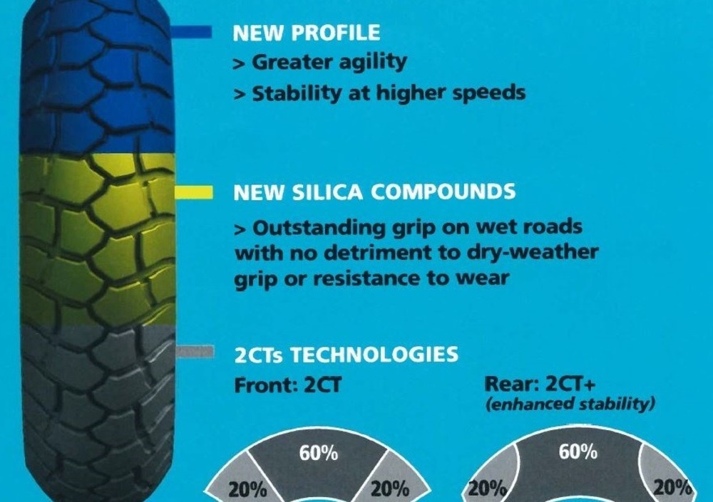 Per la prima volta arriva su pneumatici on-off Michelin la tecnologia bimescola introdotta nel 2005 sul radiale sportivo Power Race. La mescola 2CT si trova sull’anteriore Anakee Adventure, e la 2CT+ sul posteriore.