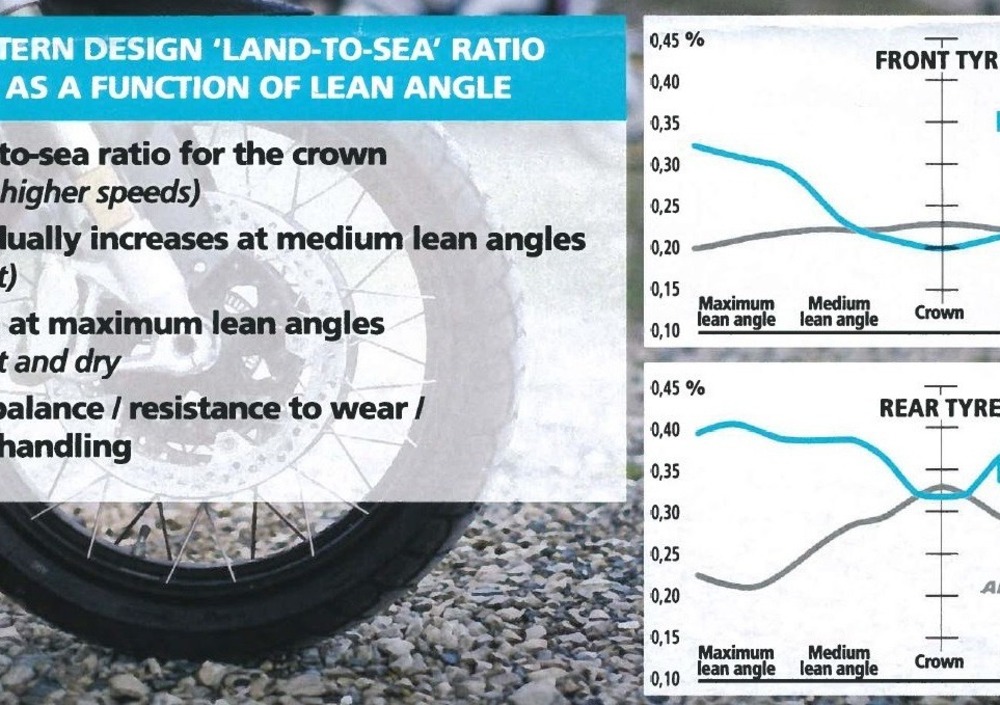 Considerati i pesi, le potenze e le velocità in gioco, soprattutto di certe maxi enduro, è importante che il profilo del battistrada resti stabile e con un consumo il più costante possibile. Per questo fra i tasselli sulle spalle ci sono dei “ponti” di congiunzione che riducendo l’altezza della scolpitura contengono il movimento del battistrada. Infine, per ridurre la rumorosità innescata dall’effetto risonanza dei tasselli, questi ultimi hanno larghezze differenti a seconda della loro posizione sulla circonferenza del pneumatico.