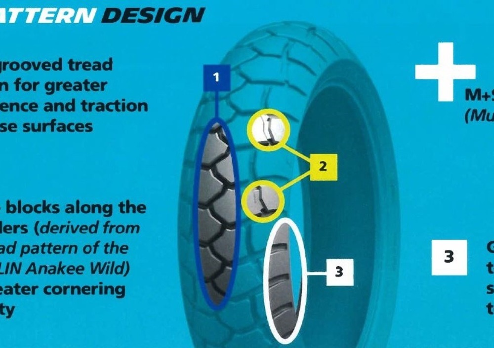 Il nuovo disegno del battistrada, decisamente più fuoristradistico rispetto alle Anakee 3, prevede maggiori vuoti e tasselli più definiti, per un approccio più deciso nella guida fuori dall’asfalto: il che contribuisce anche a un aspetto estetico più "Adventure" del pneumatico.