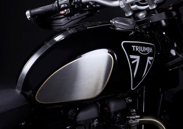 La moto si distingue per un serie di particolarità, a cominciare dalla speciale colorazione Sapphire Black, con uno stemma Triumph oversize sul serbatoio e una decalcomania in lamina di alluminio con filettatura color oro verniciata a mano.