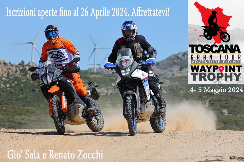 In programma dal 3 al 5 Maggio è un evento turistico sportivo di tipo “Adventouring” in due tappe, che si svolge con un percorso 70% del tempo in fuoristrada e 30% su asfalto attraverso gli incantevoli scenari della regione Toscana. Come tutti i Gran Tour di Adventure Riding sono previste due categorie a scelta dei partecipanti: “Adventouring” o “Way Point Trophy”. Per iscrivervi avete ancora pochi giorni: le iscrizioni sono aperte fino al 26 aprile.