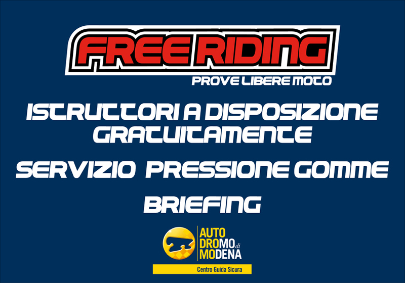 Nelle giornate Free Riding a Modena, ad ogni giornata di prove libere, saranno sempre presenti gli istruttori della Riding School a disposizione gratuitamente di tutti gli esordienti per dare qualsiasi consiglio e indicare le traiettorie con giri dimostrativi dedicati in pista.