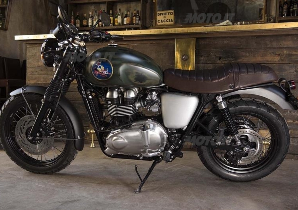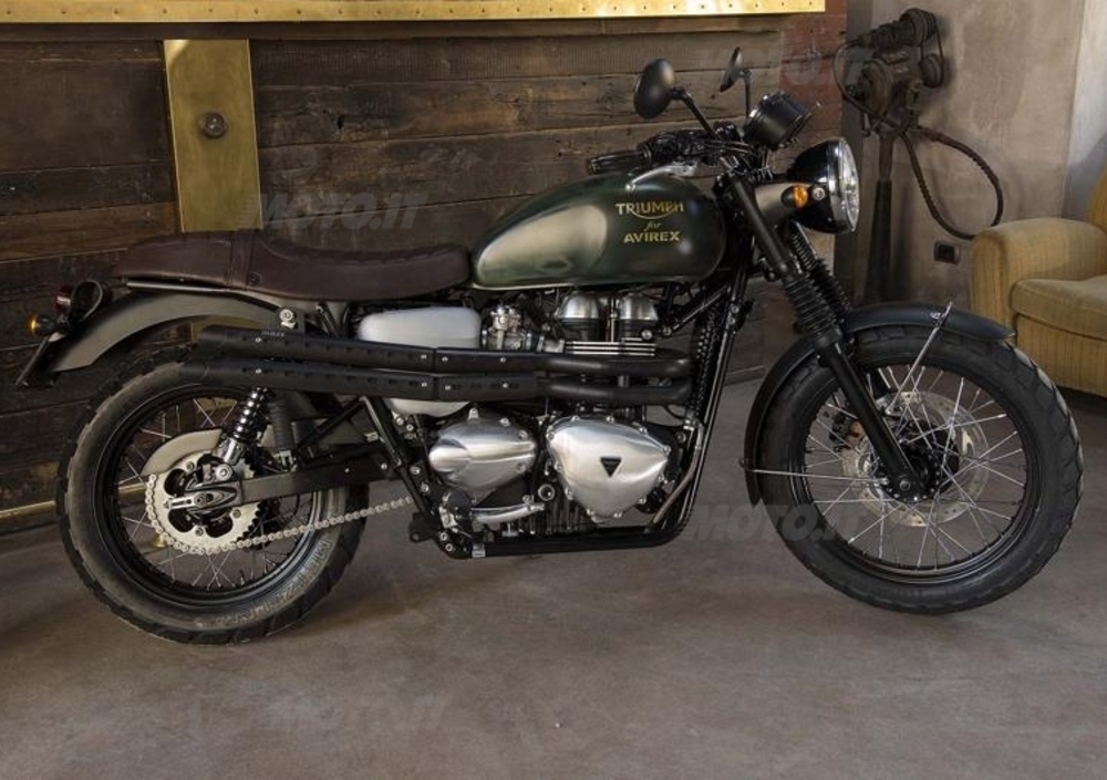 Durante la presentazione, in una bella serata milanese, gli occhi dei tanti appassionati presenti erano ovviamente tutti per lei, The Great Escape: la bicilindrica Bonnie, vestita per l'occasione da dettagli originali che ne vanno ad esaltare il carattere. A partire dalla verniciatura camo, sino ad arrivare agli scarichi alti affusolati. E poi le manopole in stile retrò e una sella realizzata con la stessa pelle dei giubbotti Avirex.