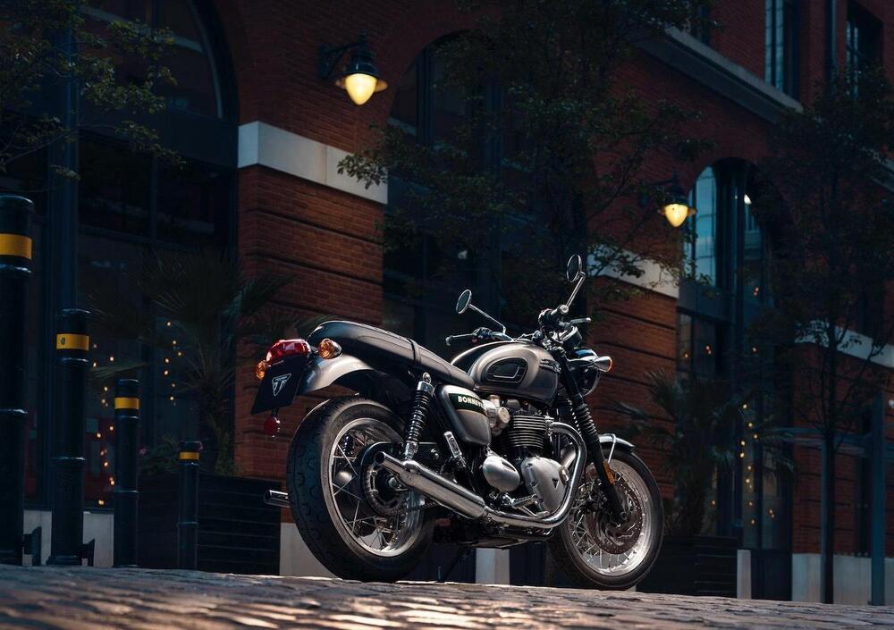 La T120 Black è caratterizzata da serbatoio, faro anteriore, pannelli laterali e parafanghi Matt Sapphire Black, con fascia centrale serbatoio in Matt Silver Ice decorata con filetto dorato realizzato a mano e logo ‘gold line’. La grafica dei fianchetti è in Matt Silver Ice con il nuovo badge Bonneville T120 Black nero/oro e filetto dorato. Anche qui è disponibile un parabrezza in tinta come optional.
