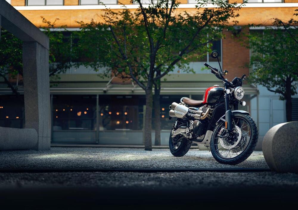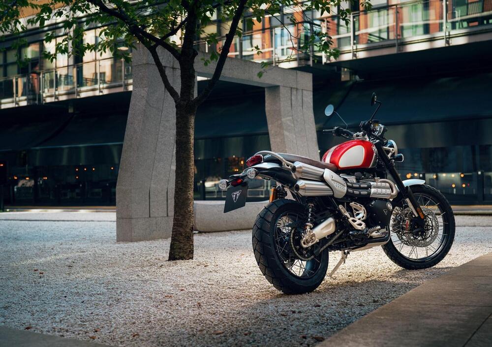 La più stradale delle due Scrambler è caratterizzata da un serbatoio Carnival Red e Storm Grey con banda decorativa in Aluminium Silver, fianchi spazzolati e rifiniti con logo ‘gold line’ e filetto dorato fatto a mano. Pannelli laterali e coperchio faro sono in Jet Black.