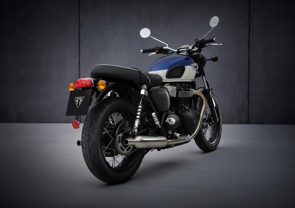 Sul piano dello stile, è stata riprogettata la strumentazione con nuovi quadranti marcati Bonneville e nuove grafiche, ma sono tanti i dettagli che distunguono la T 100: bordo a contrasto sulla sella, protezioni per le ginocchia negli incavi sul serbatoio, parafango posteriore in acciaio, specchietti cromati, manubrio cromato, luce posteriore a LED, cornice del faro cromata e tappo del serbatoio cromato