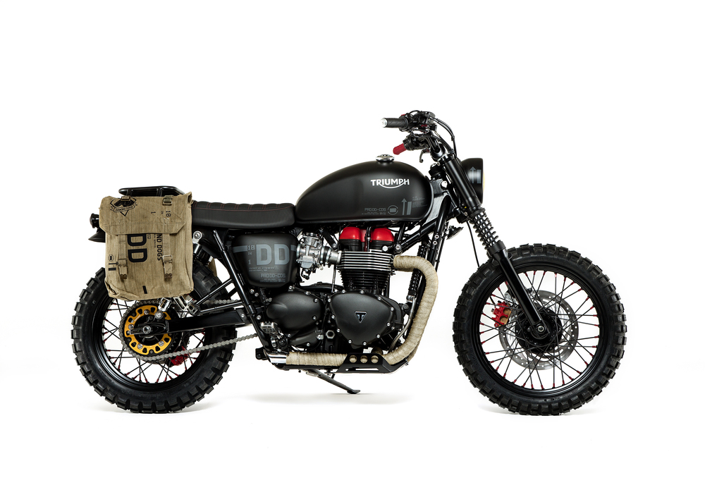 Il faro giallo della JVB e le molle esterne della forcella donano uno stile ancor più aggressivo alla parte frontale, caratterizzata dall’assenza del parafango. Le pinze e la cover valvole sono in tinta, mentre gli scarichi tagliati offrono una colonna sonora che da vita all’intero look. Le pedane da off-road arrivano dalla Triumph Tiger.