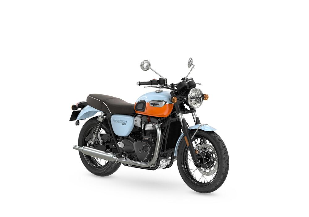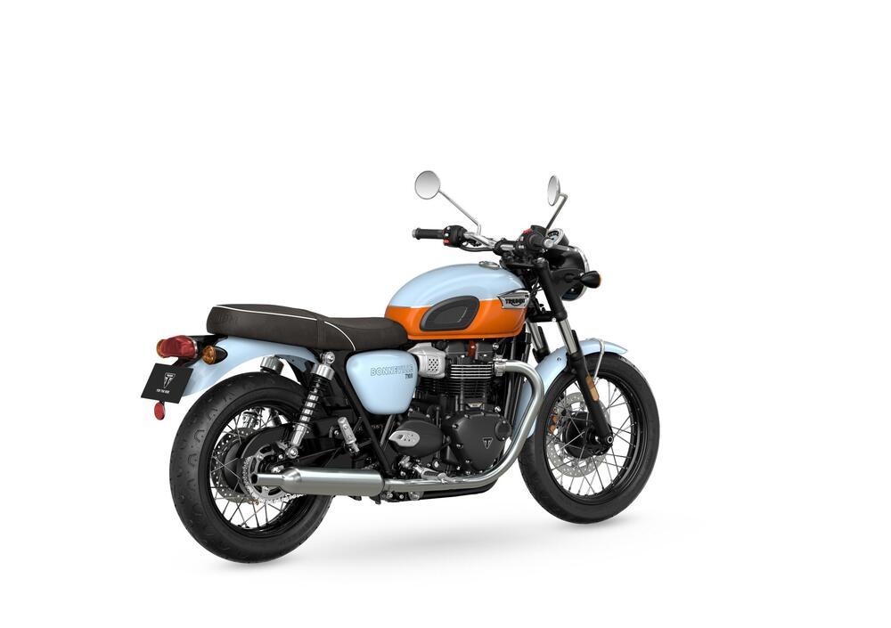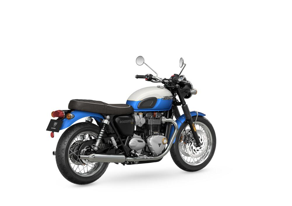 La Bonneville T120 mantiene il classico Jet Black e il sofisticato Cordovan Red e Silver Ice, mentre si aggiunge il nuovo Aegean Blue e Fusion White con dettagli dorati del serbatoio rifiniti a mano, mentre la Bonneville T120 Black verrà offerta nella variante Jet Black e nella colorazione Sapphire Black e Matt Sapphire Black, con serbatoio dalla grafica sdoppiata e dettagli in argento del serbatoio rifiniti a mano.