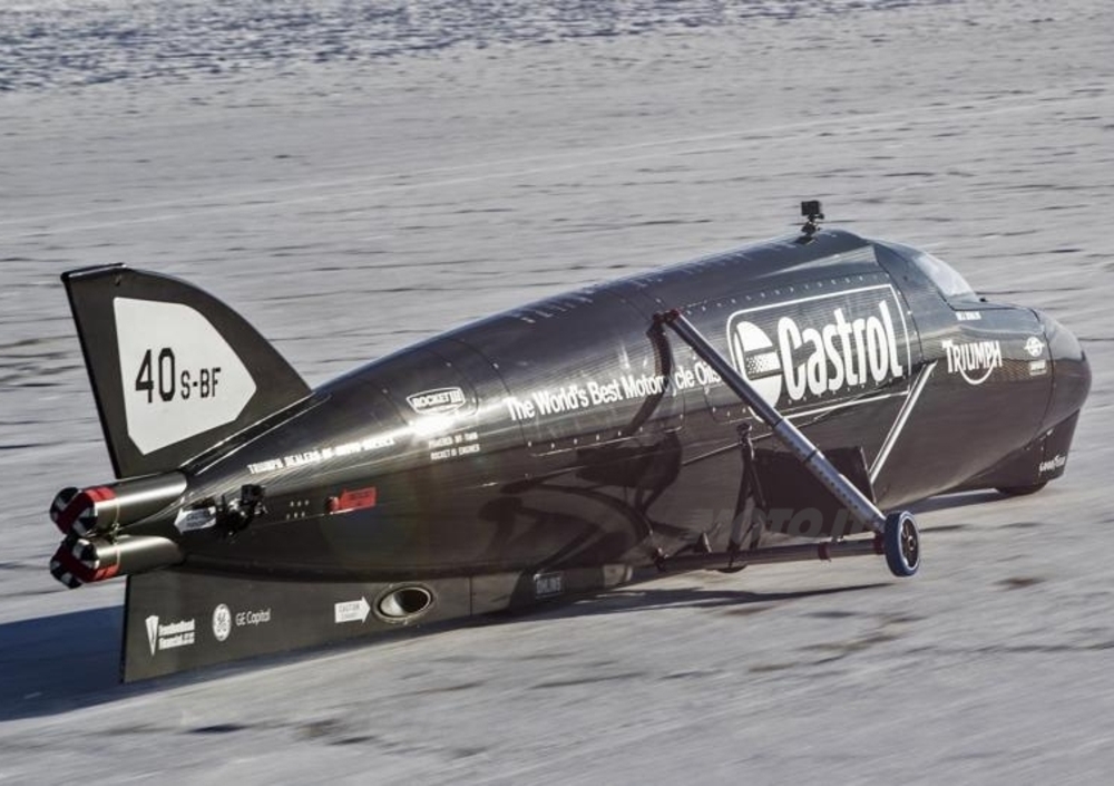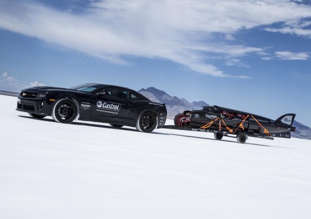 Triumph Motorcycles, già vincitrice del record di velocità negli anni 70 con una Bonneville speciale, ci riprova nel 2014 sul Lago Salato con la sua moto siluro spinta da due motori turbo tre cilindri Rocket. Con 1.000 cavalli punta a superare le 400 miglia orarie (oltre 650 km/h).