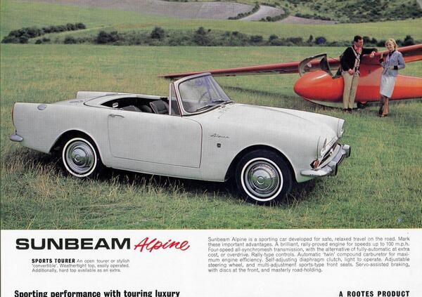 Per quanto riguarda le auto, il marchio Sunbeam è tornato ad avere una buona notorietà nel dopoguerra grazie principalmente alla Alpine, una simpatica due posti che negli anni Sessanta ha avuto una certa diffusione anche da noi. Sono state costruite diverse versioni con motori (sempre a quattro cilindri con distribuzione ad aste e bilancieri) aventi cilindrate comprese tra 1,5 e 1,7 litri. Le potenze andavano da poco più di 50 a oltre 90 cavalli. Dalla Alpine è stata derivata la Tiger, destinata al mercato USA e azionata da un V8 Ford di 4,2 litri da 164 cavalli.