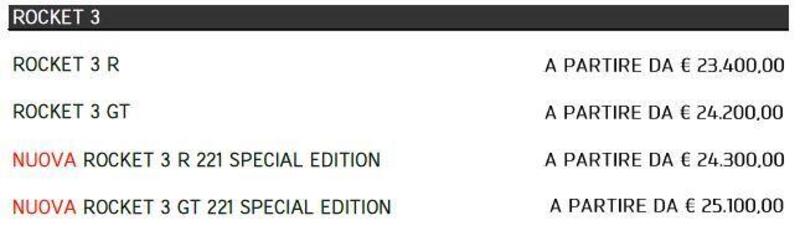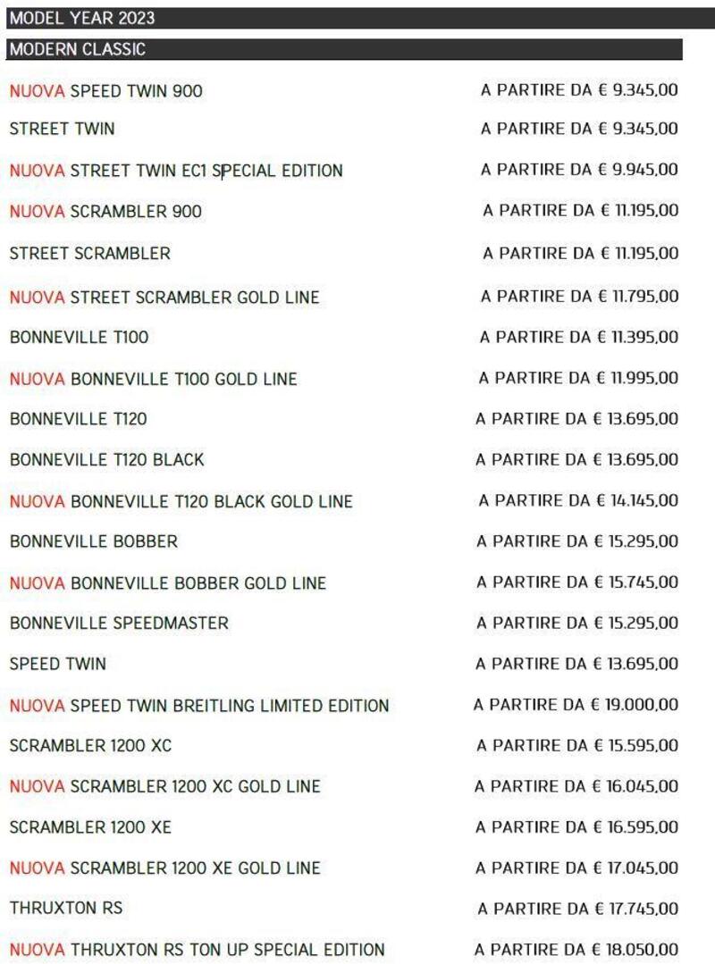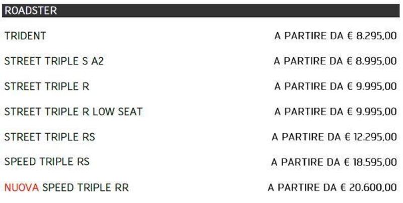 Due esempi su tutti: la Street Twin passa da 9.250 a 9.345 euro, la Speed Triple 1200RS da 18.100 a 18.595 euro.