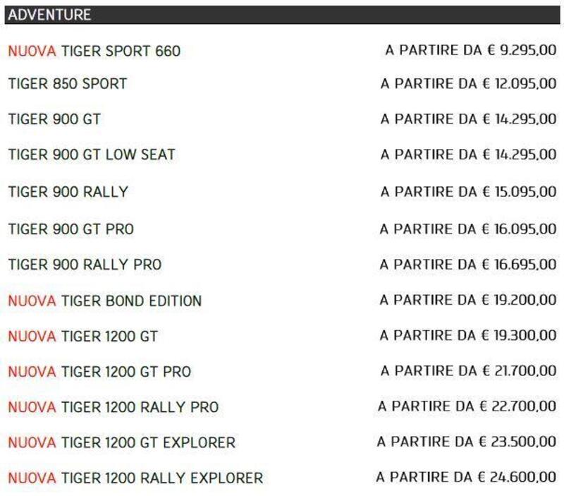 Tutti i prezzi si intendono con IVA e franco concessionario. Includono due anni di assistenza stradale e due anni di garanzia, che salgono a quattro per la serie Tiger 1200.