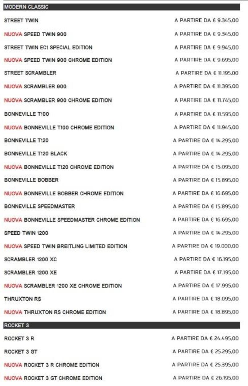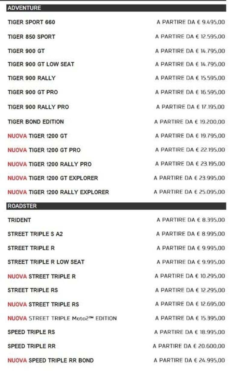 Tutti i prezzi sono ovviamente Franco Concessionario e IVA inclusa: includono due anni di Assistenza Stradale e due anni di Garanzia, che diventano quattro per la gamma Tiger 1200.