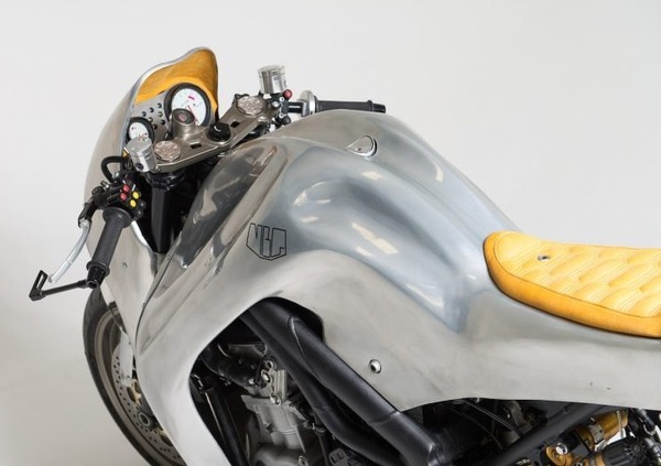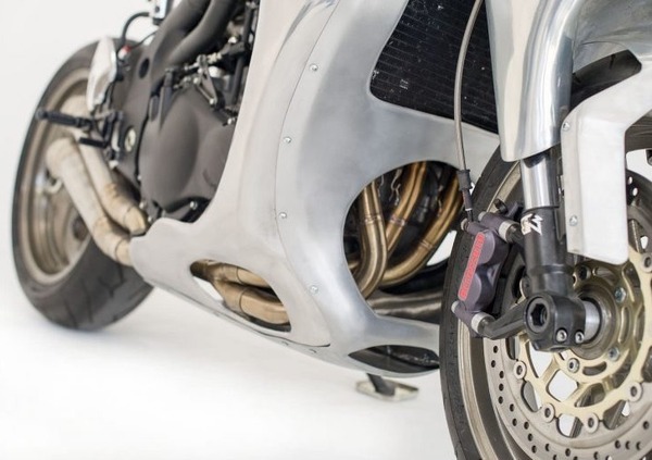 La parte più affascinante è che la carrozzeria è stata realizzata battendo pazientemente a mano due sole lastre di alluminio, e sono state impiegate diverse centinaia di ore di lavoro per ottenere un le giuste simmetrie. La piccola sezione anteriore della carenatura è stata rivettata, donando alla moto un aspetto quasi aeronautico, e il sedile in pelle artigianale è stato realizzato su misura.