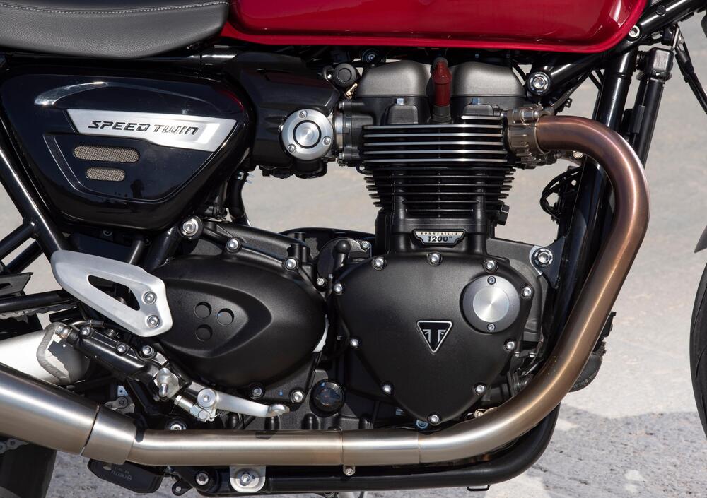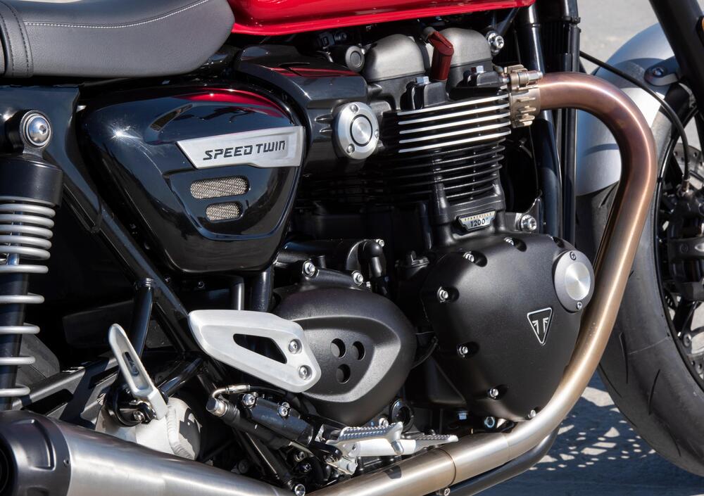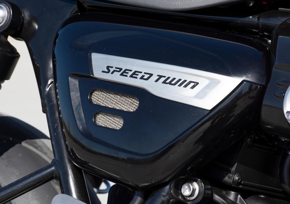 La base della Triumph Speed Twin è rimasta identica rispetto al modello 2019/2020: stesso telaio in tubi d'acciaio, stesso doppio ammortizzatore posteriore, identico forcellone. Dal lato estetico troviamo nuovi silenziatori in acciaio spazzolato, nuovi supporti anodizzati per il gruppo ottico anteriore (alogeno ma con DRL a LED) e nuovi supporti per il parafango anteriore. Finiture, come ci ha ormai abiutato Triumph, di ottimo livello; troviamo così il bel tappo del serbatoio (da 14,5 litri) “Monza”, parafanghi in alluminio spazzolato, specchietti “bar end”, indicatori di direzione e gruppo ottico posteriore a LED, fianchetti con loghi in alluminio ma anche solo il colpo d'occhio della strumentazione classica a due strumenti circolari dà la misura della cura nei dettagli profusa nella Speed Twin dove non si trova veramente una caduta di stile, un cavo fuori posto o un dettaglio che devii dalla raffinata essenzialità che sembra attraversare l'intero progetto e l'unico rammarico è l'indispensabile radiatore, anche se si è fatto il possibile per renderlo meno ingombrante sia dimensionalmente che visivamente. Nascosta sotto la sella troviamo una presa USB, mentre TPMS e manopole riscaldabili sono optional.