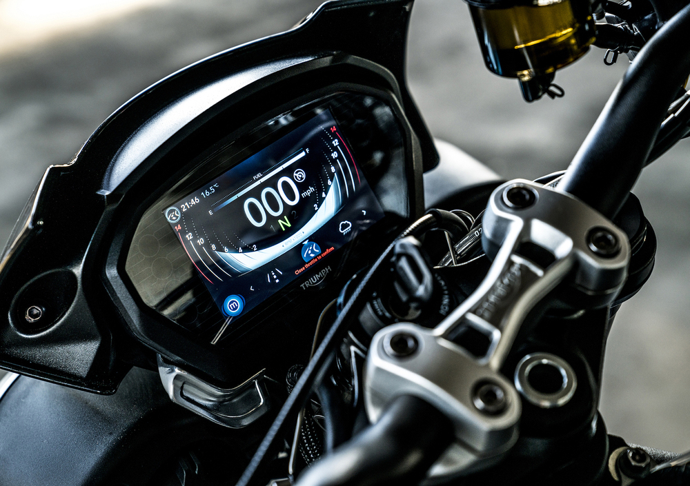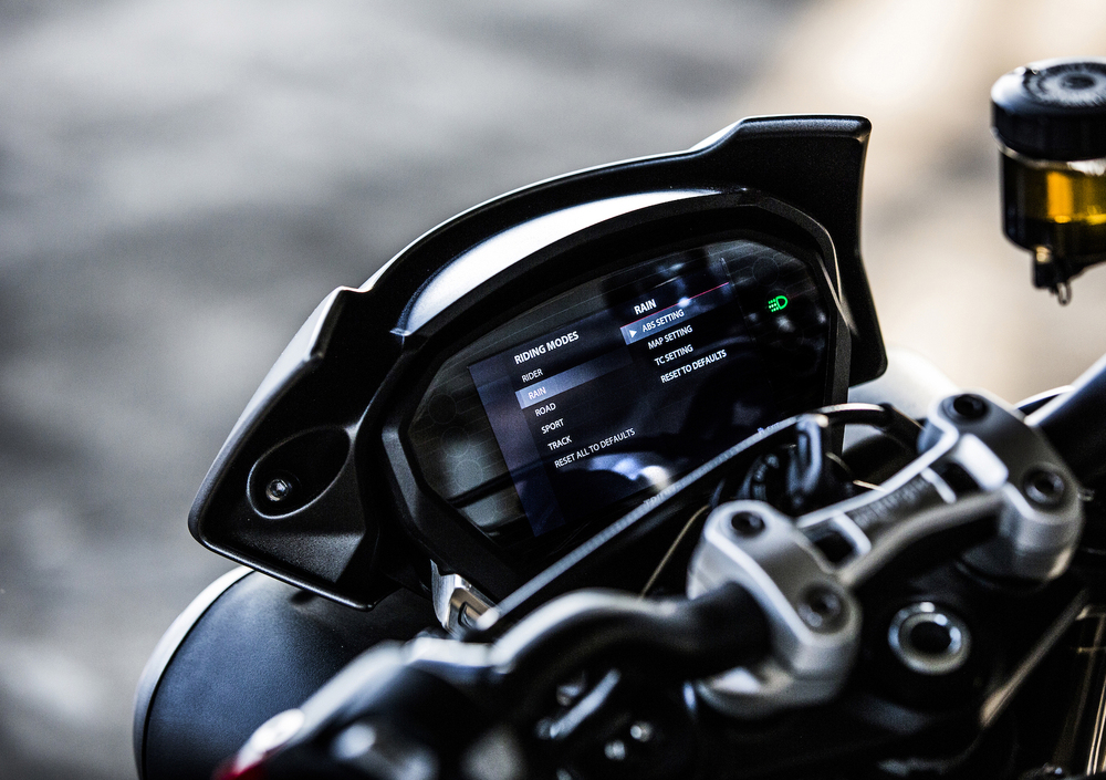 Per tutte e tre le versioni arriva il ride-by-wire, con riding mode (fino a 5, a seconda della versione), ABS e controllo di trazione con diversi livelli di intervento. Si inizia con i due della Street Triple S, che offre Rain e Road, la R aggiunge la Sport e una modalità programmabile, mentre la RS aggiunge la Track e la funzionalità evoluta per l’ABS.