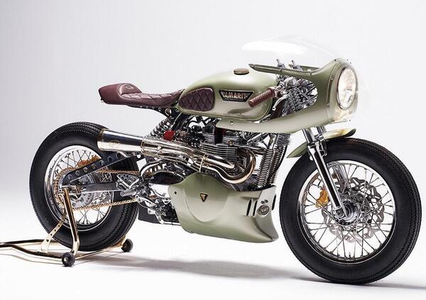 Una special nata per specifica volontà di Tamarit e non su richiesta di un cliente, tanto che a breve questo esemplare unico andrà all'asta attraverso la casa francese Artcurial. Ad Alicante sono partiti dalla base di una Triumph Thruxton 900 a caburatori (ne trovate diverse in vendita fra il nostro usato), su cui hanno lavorato tantissimo sia sul propulsore che su ciclistica e sovrastrutture, utilizzando tante parti del catalogo Tamarit ma realizzando anche diversi dettagli da zero per questo esemplare specifico.