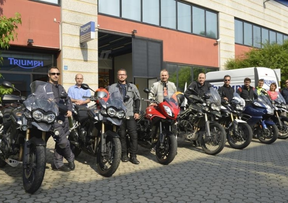 Arrivo con qualche minuto di ritardo, e a causa di questo contrattempo sono l'ultimo giornalista a impossessarsi della moto. Le tricilindriche schierate davanti alla Triumph Italia sono di vario genere e prevedono una serie di Tiger 1200, oltre a una Trophy 1200, una Tiger 800 XC, una Tiger Sport 1050 e una Tiger 800, quest'ultima è stata prescelta per il sottoscritto dai colleghi più puntuali.