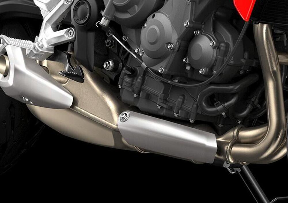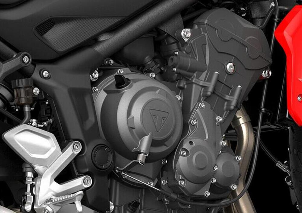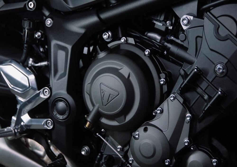 Un propulsore derivato sicuramente dal 660 cc che attualmente spinge la Street Triple S, ma profondamente rivisto in ben 67 componenti - corpi farfallati, carter, assi a camme, camicie cilindri, quasi tutto il cambio, il contralbero, condotti d’aspirazione fra gli altri - tanto da poter parlare di un motore completamente nuovo almeno quanto il resto della moto.