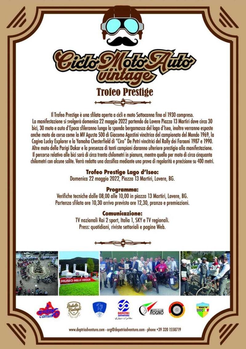 Domenica 22 maggio appuntamento a Lovere per il Trofeo Prestige, una iniziativa del grande Ciro De Petri. Il Trofeo Prestige è una sfilata riservata a cicli e moto “sottocanna” costruiti prima del 1930: trenta biciclette e altrettante moto (più alcune auto d’epoca), sfileranno sulla sponda bergamasca del lago d’Iseo su due percorsi: i pedalatori saranno impegnati su circa trenta km di pianura, i motorizzati si spingeranno oltre, per una cinquantina di km con qualche salita.