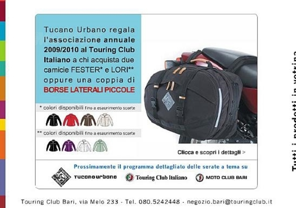 Per tutto ottobre, inoltre, lo stesso negozio sarà sede di un corner personalizzato Tucano Urbano. Chi vi acquisterà due camicie FESTER e LORI oppure una coppia di BORSE LATERALI PICCOLE riceverà in omaggio l'associazione annuale 2009/2010 al Touring Club Italiano.