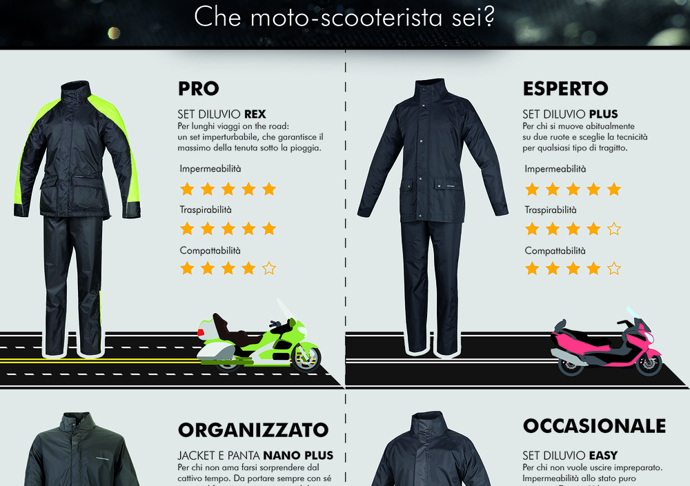 Diego Sgorbati (AD di Tucano Urbano) è stato obbligato - senza troppa fatica, a dire il vero - a indossare i suoi capi e a testarli per noi in sella a una BMW F800GS Adventure. Abbiamo simulato una pioggia di forte intensità, utilizzando una idropulitrice professionale, con una pressione massima fino a 140 bar e una portata d'acqua pari a circa 500 litri/ora (di norma è impiegata per pulire i trattori). Abbiamo sparato l'acqua a una distanza ravvicinata (mai superiore a tre metri e inferiore a uno), insistendo col getto per diversi minuti nelle zone critiche (cuciture e tasche in particolare).