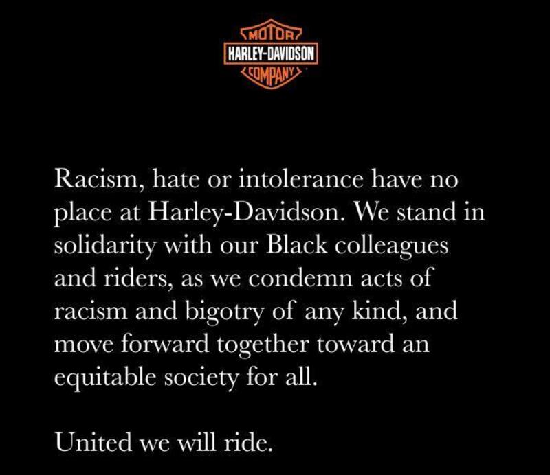 “Il razzismo, l'odio o l'intolleranza – è scritto – non hanno spazio in Harley-Davidson. Siamo solidali con i nostri colleghi e motociclisti Neri, condanniamo gli atti di razzismo e i settarismi di ogni tipo, procediamo insieme verso una società che sia più giusta per tutti”.