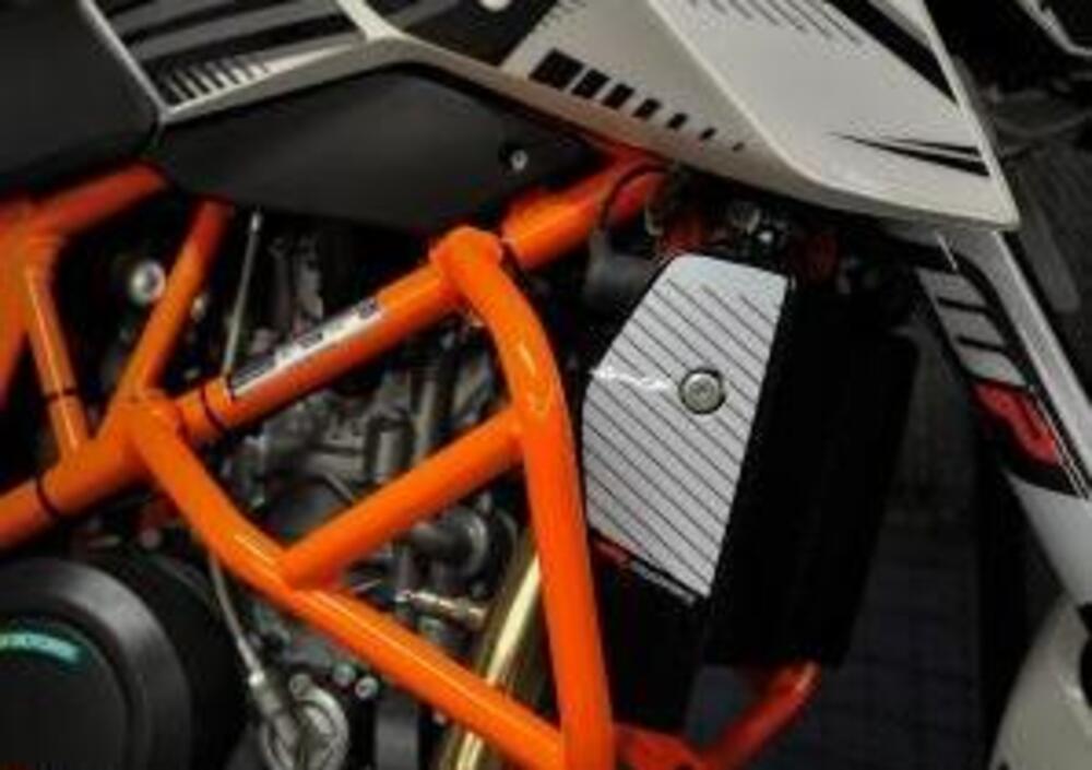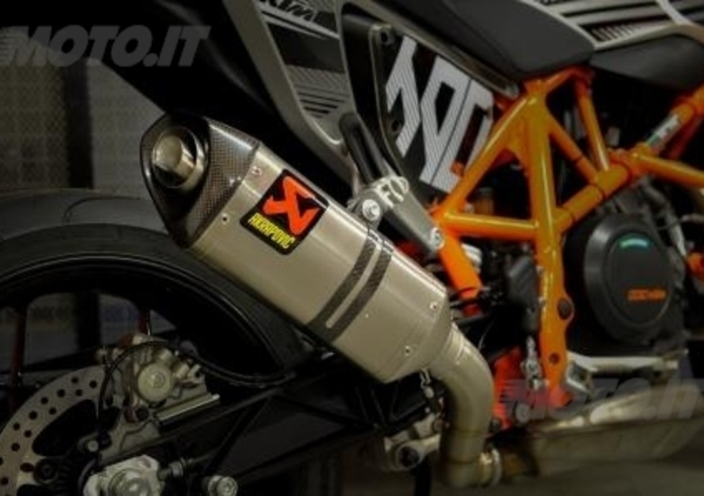 Il kit - del valore di ben 1.150 euro - comprende le grafiche Duke 4, le staffe di protezione serbatoio (ovviamente arancioni), l'adesivo di protezione serbatoio, il coperchio filtro trasparente e un silenziatore omologato Akrapovic in titanio con fondello in fibra di carbonio.