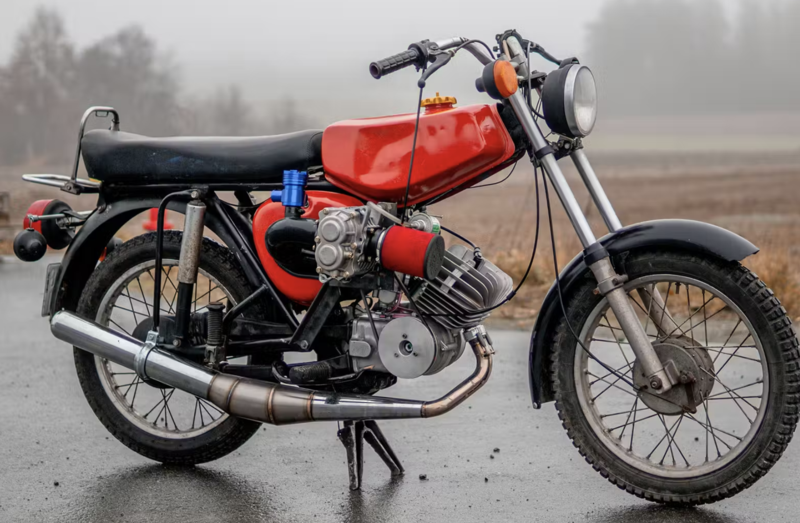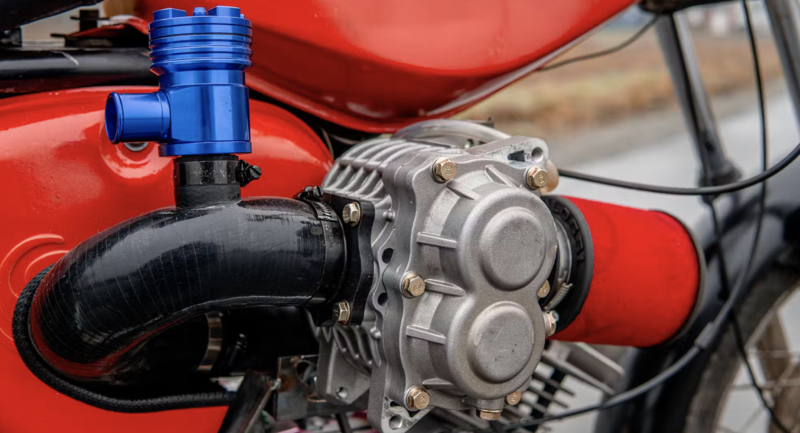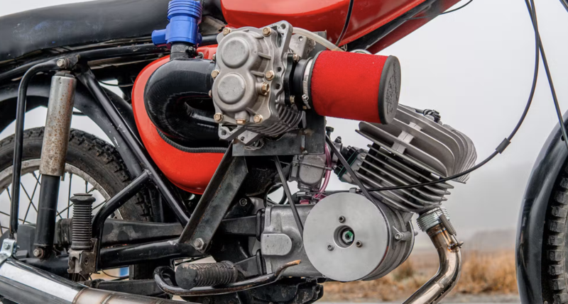 L’idea iniziale, però, era ancora più estrema: montare un turbo sul motore originale del celebre 50cc dell’Est. Ma il vecchio due tempi Simson non ha retto a lungo le sollecitazioni. Da qui la decisione di cambiare strada, passando dalla sovralimentazione a gas di scarico a un compressore meccanico, più gestibile su questo tipo di base tecnica.
