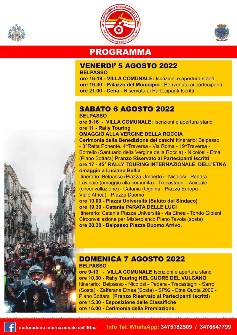 Per quest'anno l'appuntamento è come al solito a Belpasso (Catania) dal 5 al 7 agosto : venerdì 5 agosto si apriranno le iscrizioni e verrà ricordato il Prof. Luciano Bellia durante la cerimonia ufficiale di apertura della manifestazione, mentre sabato 8 agosto sono previsti due Rally Touring: “Omaggio alla vergine della Roccia” per la benedizione dei caschi e, nel pomeriggio, il tradizionale Rally Touring Internazionale dell’Etna che attraversando i paesi di Nicolosi, Pedara, Trecastagni e Acireale giungerà intorno alle ore 19 a Catania per il saluto di benvenuto del Sindaco della città metropolitana.
