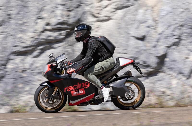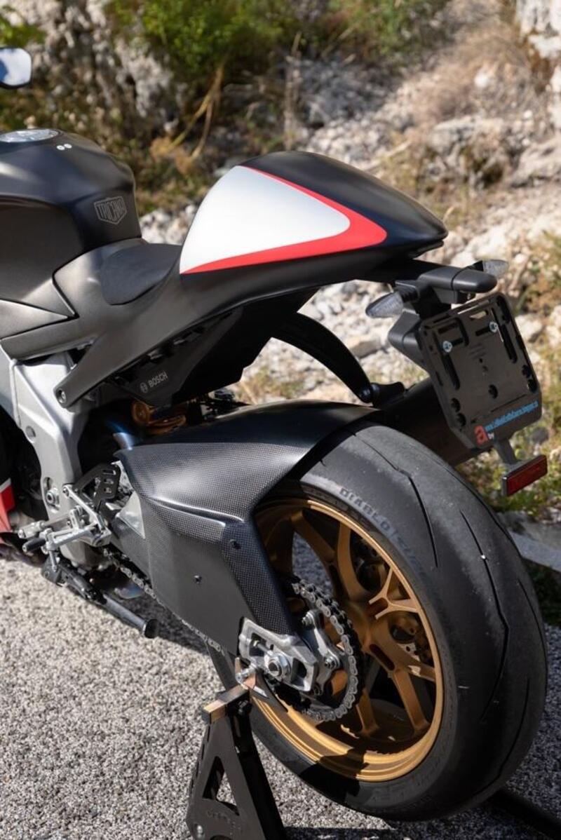 Per ottenere questo risultato si è ricorso alla realizzazione di numerosi particolari in fibra di carbonio (carenatura, l'avvolgente parafango posteriore, le prese d'aria anteriori) tutti costruiti espressamente da Carbone Junkie Switzerland, mentre Corbex SA ha pensato al telaietto di supporto per il gruppo ottico anteriore e alla verniciatura: tra l'altro, soltanto il leone (simbolo racing di Aprilia) e le scritte Aprilia Racing sono adesivi, tutto il resto è verniciato! Chapeau! Jake Apiata si è occupato del necessario adeguamento elettrico dei fari della Rs250 al cablaggio della RSV4 e alla ottimizzazione di tutto l'impianto elettrico, mentre la sella è di Biman. Ovviamente, sotto le spoglie della bicilindrica da 65 cavalli, batte il potentissimo V4: tecnicamente la moto è immutata sia nella ciclistica che nel motore rispetto alla RSV4 e la trasformazione riguarda quindi soltanto la veste estetica.