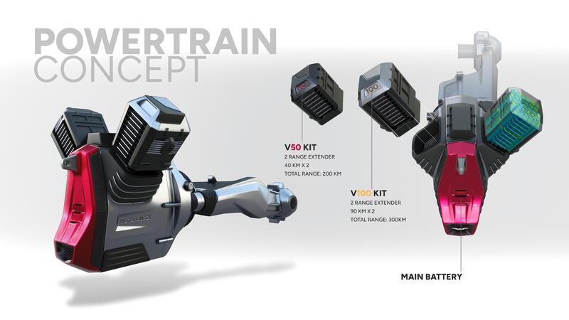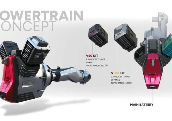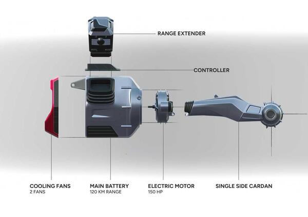 Le forme tipiche del V90 di Mandello nascondono una tecnologia differente, e quindi al posto dei pistoni all'interno dei cilindri, troviamo delle batterie aggiuntive, mentre il monoblocco e il cambio sono sostituiti dalla batteria principale, con un compatto motore elettrico che trasmette il moto all'immancabile trasmissione a cardano.