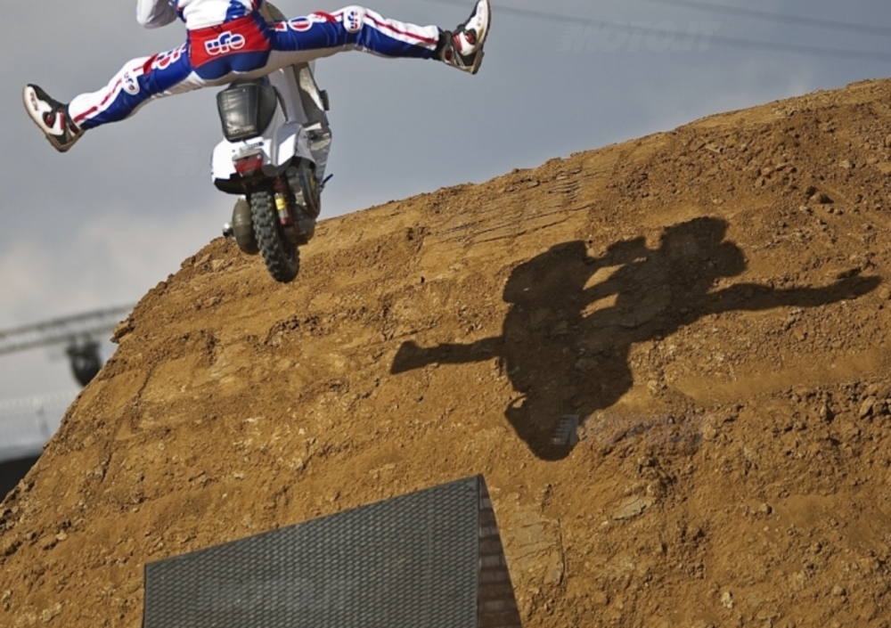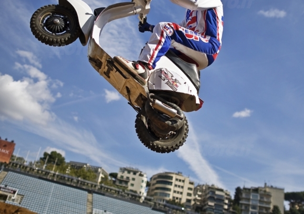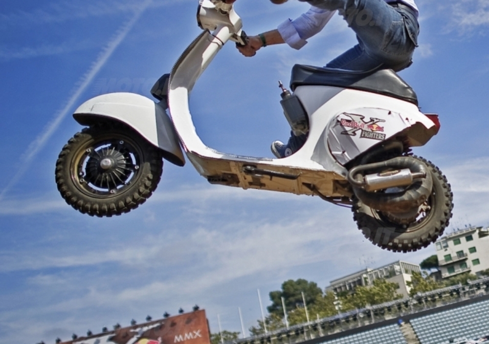 All’interno del Flaminio di Roma, in occasione dei Red Bull X-Fighters che si terranno il 2 Ottobre, si è vista aggirarsi tra le rampe una piccola Vespa intenta a provare alcuni salti, nel tentativo di emulare i campioni del motocross Freestyle.
