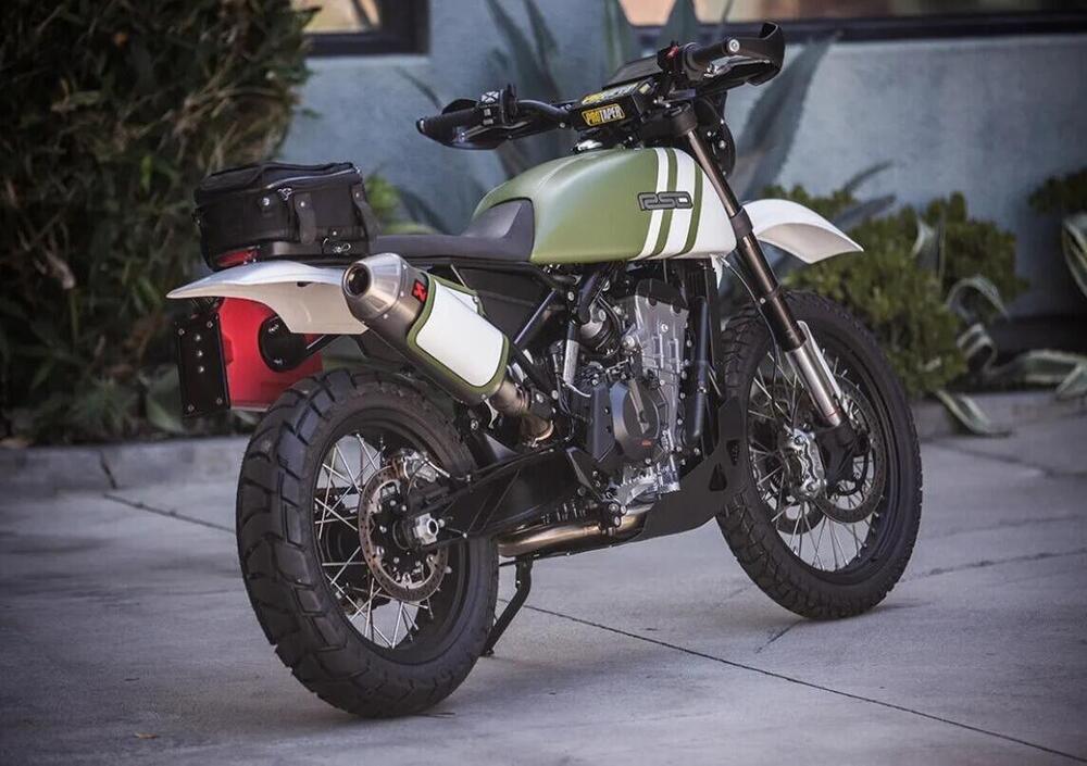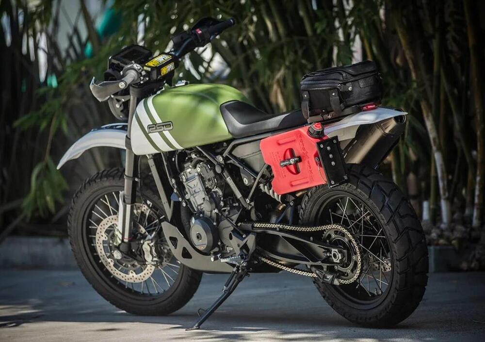 Per il resto, si è scelto di adottare un gruppo ottico anteriore Triumph su un parafango KTM d'epoca, manubrio Pro Taper, uno scarico Akrapovic sul lato destro magnificamente sormontato da una tabella portanumero in alluminio autocostruita, così come il telaietto posteriore, che fa il paio con un serbatoio supplementare che fa tanto anni '70 (solo a chi scrive questa moto ricorda le Penton-KTM?) e che dovrebbe compensare la riduzione di capacità del serbatoio principale.