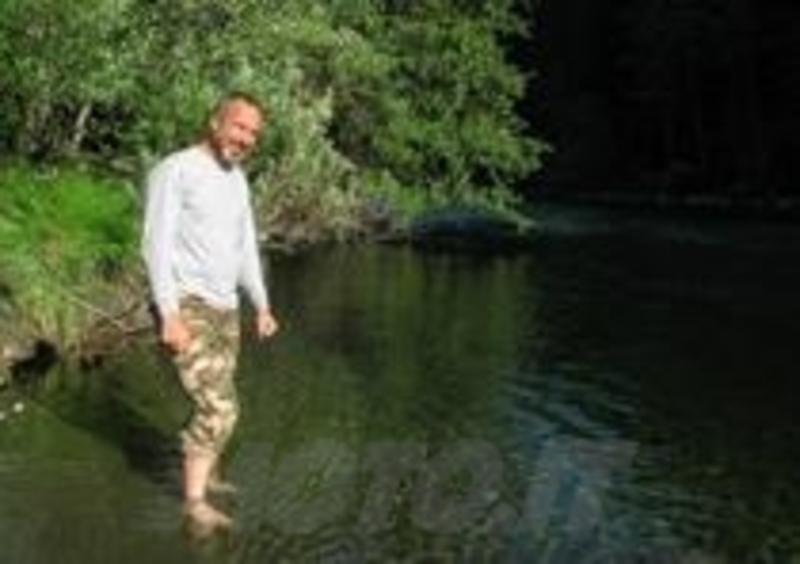 Prima di arrivare a valle ci siamo fermati a mettere i piedi nell'acqua gelata del fiume, una vera goduria visto il caldo secco e allucinate di questa zona. Percorrendo il sentierino in discesa abbiamo visto un a piccola tenda con una moto parcheggiata di fianco e subito dopo abbiamo incontrato un vecchio hippie che lavava le pentole al fiume. Ma la sorpresa più grossa è arrivata quando Sandro si è accorto che le pietrine luccicanti sul fondale non erano vetro ma pagliuzze d'oro. Il vecchio hippie non stava lavando le pentole ma setacciava la sabbia in cerca del prezioso metallo!