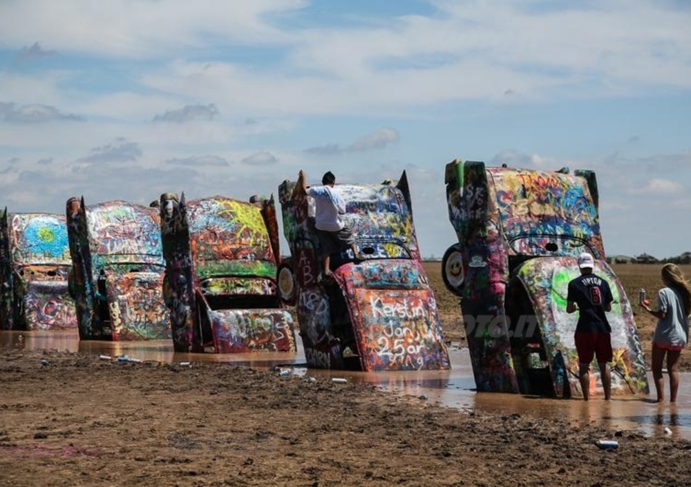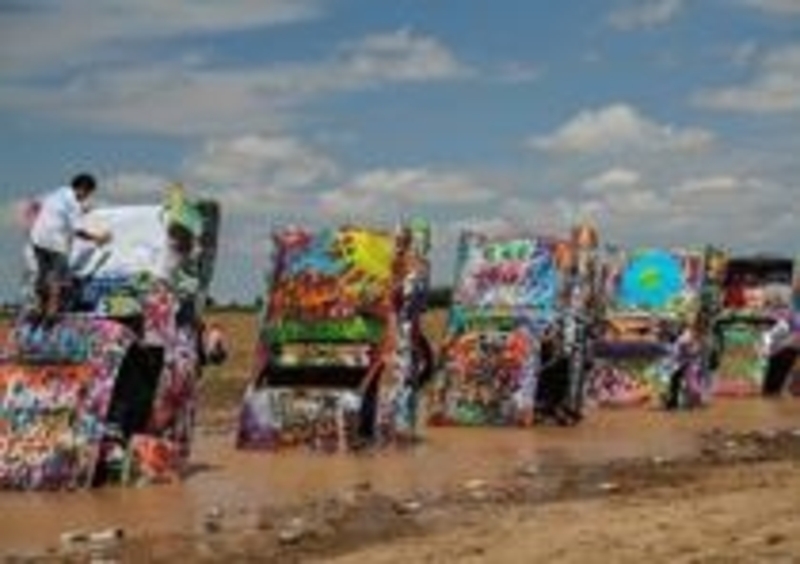 Come già saprete, Cadillac Ranch consiste in una fila di vecchie Cadillac, dal 1949 al 1963, impiantate di muso nel terreno seguendo la stessa inclinazione della piramide di Giza in Egitto (!?!). La loro decorazione originale è cambiata negli anni, e il proprietario del terreno e gran mecenate artistico Stanley Marsh III˚ ha sempre incoraggiato nuovi artisti a decorare le auto in modo sempre diverso. Il tutto è degenerato in una serie di sgorbi orrendi e graffiti più o meno apprezzabili... Periodicamnte le auto vengono riverniciate di bianco e si riparte da zero. Quando siamo passati noi la zona intorno alle auto era un pantano a causa dei recenti temporali, ma non è stato un deterrente per un folto gruppo di adolescenti armati di bombolette spray, che stavano pasticciando le povere Caddy in modo orribile. Magari invece sono io che non capisco l'arte.