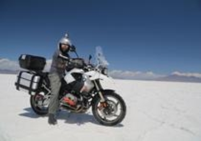 Dopo aver fatto qualche foto di rito con la Beemer (nessuno ha avuto nulla a che ridire del fatto che l'avessimo piazzata proprio in mezzo al sale) siamo ripartiti per cercare altri scorci interessanti e meno battuti. Poche miglia dopo abbiamo infilato un'uscita secondaria e siamo arrivati su una lingua di asfalto che si inoltra per un paio di miglia in mezzo alla distesa salata, roba da pelledoca. Qui abbiamo fatto altre foto, anche alla Valorosa, e abbiamo riso alla vista del pick-up di qualche redneck che ha pensato di lanciarsi sul sale umido per fare qualche numero ed invece ci è rimasto impantanato.