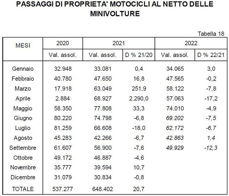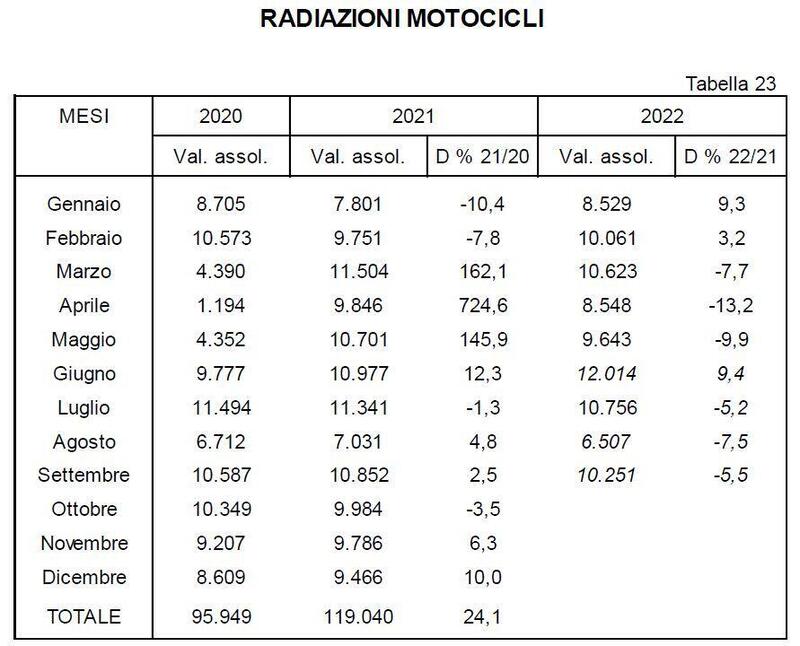 Nel periodo gennaio-settembre, le radiazioni dei motocicli (ricordiamo che questi dati sommano moto e scooter) sono state 86.932, pari a -3,2%. Negli stessi mesi le radiazioni delle automobili hanno visto una contrazione ben maggiore: -30,4%.