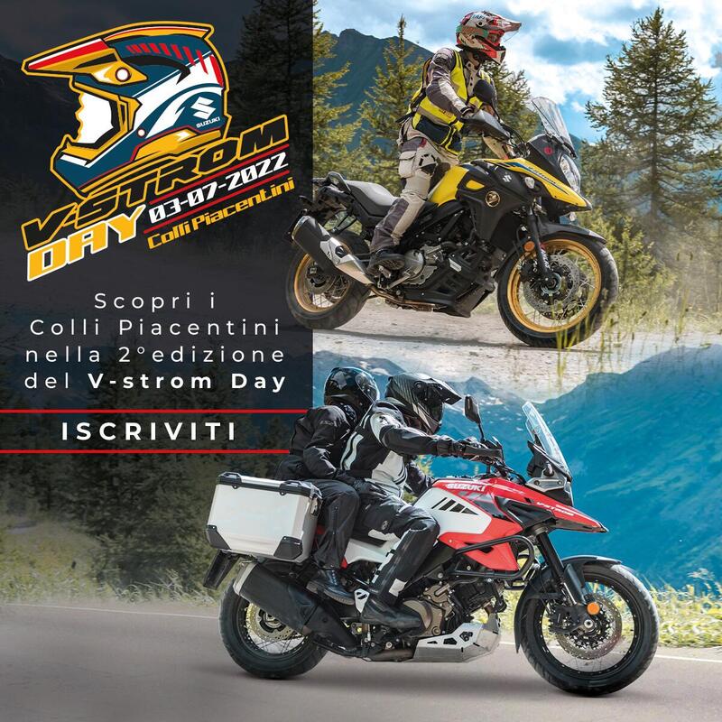 Dopo il successo della prima edizione sulle Alpi olimpiche piemontesi, Suzuki organizza il 2° V-Strom Day per domenica 3 luglio in provincia di Piacenza, con partenza da Borgonovo Val Tidone - la zona è quella del Castello di Luzzano, da alcuni anni sede della V-Strom Academy. Una giornata all’insegna della passione per le due ruote e dei viaggi in moto, il cui programma propone come clou un tour guidato di circa 130 km su strade asfaltate e facili sterrati attraverso scenari mozzafiato, tra le colline sul confine tra l’Emilia-Romagna e la Lombardia.