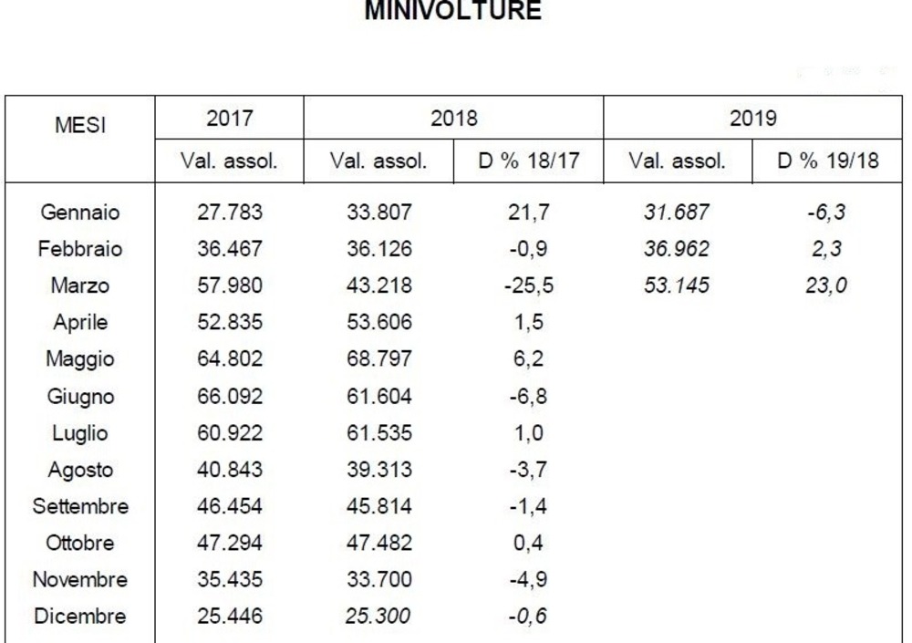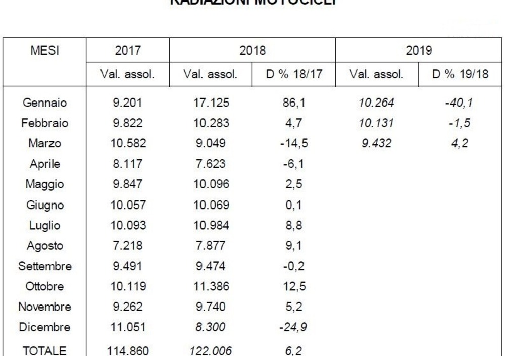 A marzo i passaggi di proprietà netti dei motocicli (quindi moto più scooter oltre 50 cc) sono stati 53.145, in crescita del 23% rispetto a marzo 2018. Si tratta di passaggi al netto delle minivolture (ovvero le registrazione al PRA di un passaggio di proprietà di un veicolo a favore di un concessionario, ai fini della rivendita a terzi): la precisazione è importante, poiché l'incidenza delle minivolture sul totale dei passaggi di proprietà dei motocicli a marzo è stato del 12,9%. Un valore che nel caso delle automobili sale, come solitamente accade, al 46%.