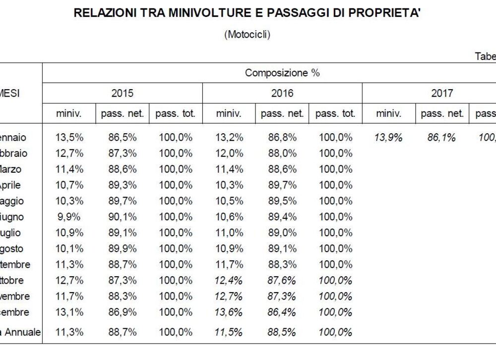 Il rapporto fra usato e nuovo a gennaio ha praticamente replicato il dato dell'intero 2016, ovvero ogni 100 nuove immatricolazioni ci sono stati 282 passaggi di proprietà. Per fare un parallelo con il settore automobilistico, il rapporto è quasi dimezzato: 149 passaggi di proprietà contro 100 auto nuove. L'usato resta quindi molto importante nel giro d'affari del settore, sebbene la sua incidenza sia leggermente calata rispetto al 2015.