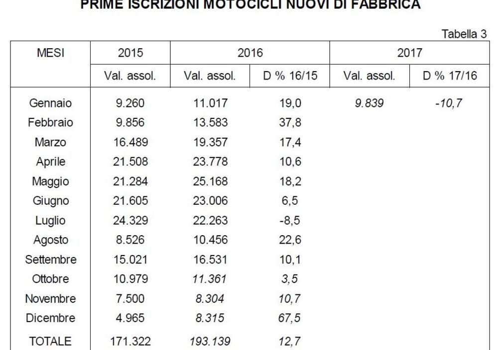 Ricordiamo che nel passarvi questi dati consideriamo le immatricolazioni unicamente per quanto concerne le prime iscrizioni al PRA di un motociclo nuovo di fabbrica, ovvero effettuato contestualmente al rilascio della Carta di circolazione. E' per questo motivo che ci sono discrepanze con i dati forniti dal Ministero dei Trasporti, che per esempio comprendono le re-immatricolazioni e a gennaio hanno accusato un calo superiore rispetto alle elaborazioni ACI.