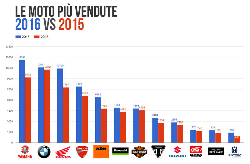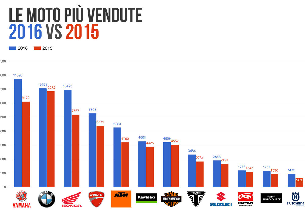Qui sotto è il grafico che confronta le vendite del 2016 con quelle del 2015 per quanto riguarda le prime dodici posizioni. In classifica è entrata al dodicesimo posto Husqvarna (tredicesima l'anno prima), mentre è uscita MV Agusta, arretrata dall'undicesima la tredicesima posizione. Da notare che tutte le marche hanno incrementato le proprie vendite, anche se la maggioranza è stata largamente al di sotto della crescita media (+21,5%), chi ha fatto meglio è Husqvarna (+45%), seguita fa Honda (+34%) KTM (+33%), Yamaha (+27%), Moto Guzzi (+24%) e Ducati (+20%). Fra chi ha migliorato con minore vigore, rispetto al 2015, ci sono Beta e Harley-Davidson.