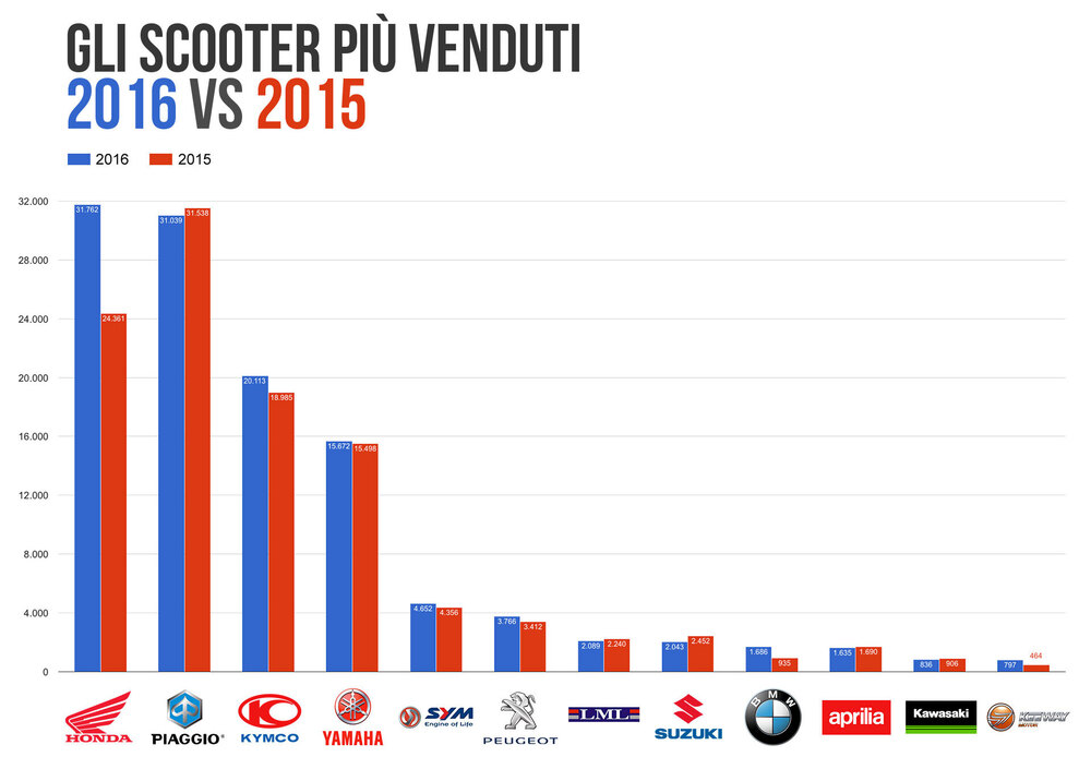 Per quanto riguarda il segmento scooter, a passare in testa alla classifica 2016 è Honda, che per un soffio la toglie a Piaggio. La marca di Pontedera nel 2015 era al primo posto con 31.538 veicoli targati, numeri che ha quasi riconfermato nel 2016 (31.039) ma arretrando di un posizione. Honda, che somma le immatricolazioni di Honda Italia, passa invece dalle 29.333 unità del 2015 alle 31.726 dell'anno scorso. Kymco si conferma al terzo posto, ed è la sola fra le marche maggiori a crescere significativamente, passando da 18.985 a 20.113 unità. Yamaha conferma a sua volta la quarta piazza, con una impercettibile crescita: da 15.498 scooter immatricolati nel 2015 ai 15.672 del 2016. Queste quattro marche messe assieme formano la prevalenza del mercato scooter italiano (l'80%) con oltre 98.000 unità su un totale di 117.878. Passando alle Case che seguono in classifica, nelle prime posizioni, un guadagno c'è stato per tutte ad eccezione di Suzuki, LML, Aprilia e Kawasaki che hanno perso qualcosa.