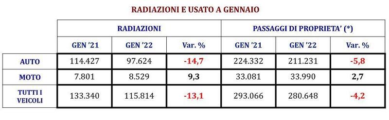 Le radiazioni automobilistiche sono state nellostesso peirodo 97.624, ovvero -14,7% nei confronti di gennaio 2021.
