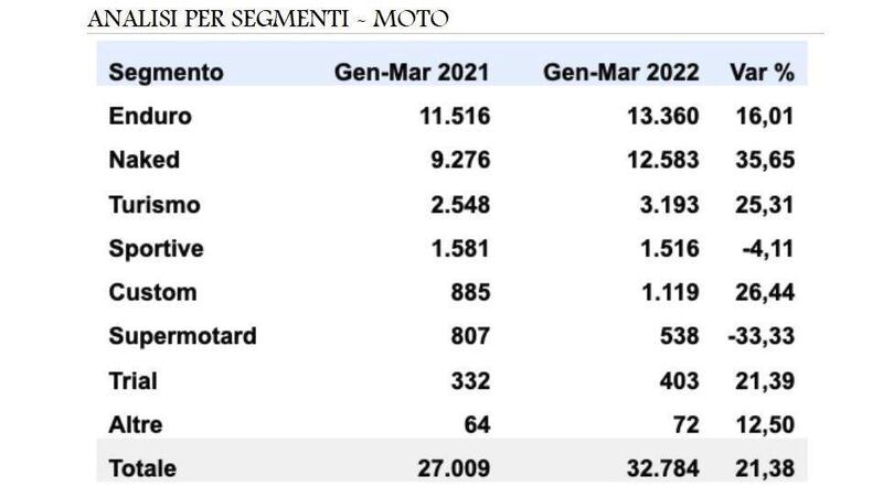Le moto vendute nel trimestre sono state 32.748, pari a un significativo +21,4% che segue il +38% registrato nel primo trimestre dell'anno scorso (nel 2020 i mesi di gennaio e febbraio erano stati in attivo e poi c'era stato il confinamento di marzo).